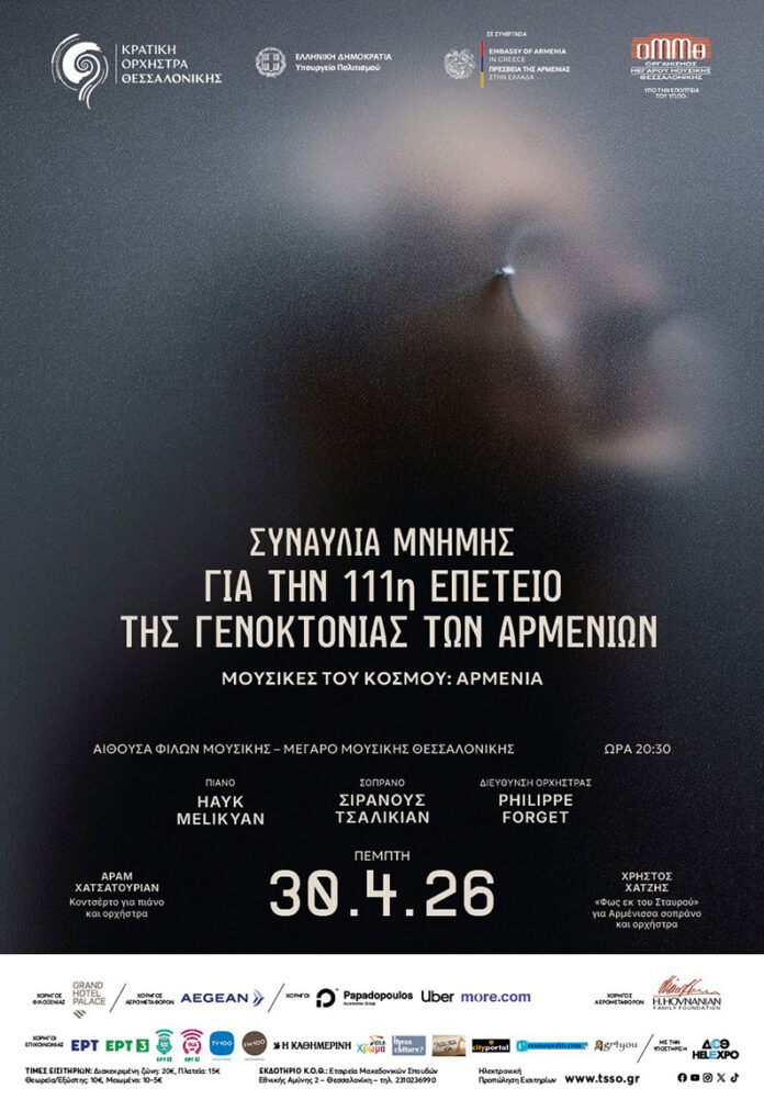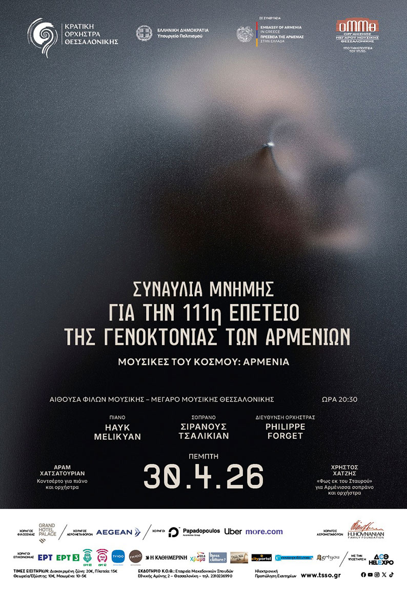 Το Μέγαρο Μουσικής Θεσσαλονίκης και η Κρατική Ορχήστρα Θεσσαλονίκης τιμούν την 111η επέτειο της Γενοκτονίας των Αρμενίων με μια συναυλία μνήμης που περιλαμβάνει δύο υπέροχα έργα του Αράμ Χατσατουριάν και του Χρήστου Χατζή και φιλοξενεί σπουδαίους καλλιτέχνες επί σκηνής. Η συναυλία πραγματοποιείται σε συνεργασία με την Πρεσβεία της Αρμενίας στην Ελλάδα και θα διεξαχθεί την Πέμπτη, 30 Απριλίου 2026, στις 20:30 στην Αίθουσα Φίλων Μουσικής (Μ1).