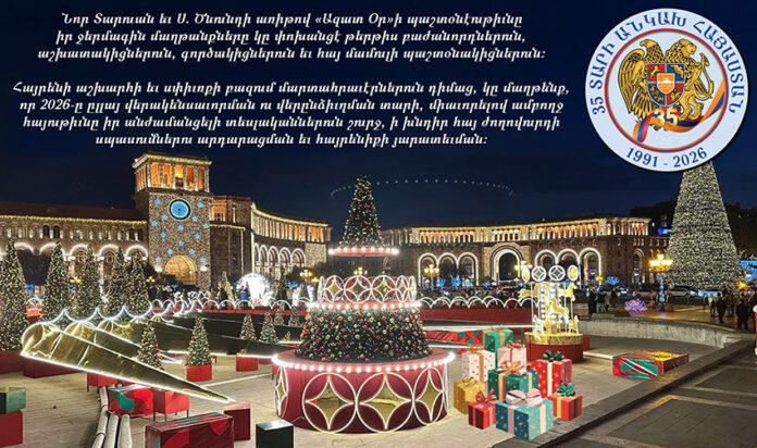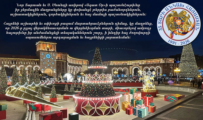 ԳԼԽԱՒՈՐ ԷՋ Χωρίς κατηγορία Ազատ Օրի Նոր Տարուան մաղթանքը Χωρίς κατηγορία Ազատ Օրի Նոր Տարուան մաղթանքը 31 Դեկտեմբեր 2025 17 0 ՅԱՐԱԿԻՑ ՅՕԴՈՒԱԾՆԵՐԱՒԵԼԻ ՇԱՏ ՀԵՂԻՆԱԿԻ Χωρίς κατηγορία Յունաստանի հայկական համայնքի ծանօթացման ներկայացում Χωρίς κατηγορία Լոյս տեսաւ «Արմենիքա» պարբերաթերթի նոր թիւը Χωρίς κατηγορία Կեանքէն հեռացաւ հայ մամուլի վաստակաշատ խմբագիր Ռոպէր Հատտէճեան - Advertisement -Վերջին գրառումներ Ազատ Օրի Նոր Տարուան մաղթանքը 31 Դեկտեմբեր 2025 Հայութեան ճակատագրական խաչմերուկը 31 Դեկտեմբեր 2025 Հ.Յ.Դ. Յունաստանի Կեդրոնական կոմիտէի խօսքը 2026-ի Նոր Տարուան շեմին 31 Դեկտեմբեր 2025 ԽՕՍՔ ԾՆՆԴԵԱՆ 31 Դեկտեմբեր 2025 Յունահայոց Ազգային Վարչութեան Նոր Տարուան մաղթանք 31 Դեկտեմբեր 2025