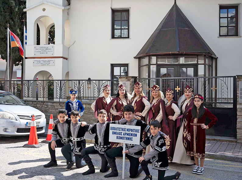 ­Փո­ղոց­նե­րուն ներ­կայ ա­նուն­նե­րը հայ­կա­կան եր­բեմ­նի ներ­կա­յու­թեան մը վկա­ներն են քա­ղա­քի այս մա­սին մէջ. Իօան­նու ­Ցի­միս­քի (­Յով­հան­նէս Չմշ­կիկ)՝ հայ­կա­կան ծա­գու­մով ­Բիւ­զան­դիոյ կայսր, Λεωφ. Αρμενίου (­Հայ­կա­կան փո­ղոց), ­Ռու­բէն ­Գէոր­գեան՝ ­Գո­մո­թի­նիի կա­ռա­վա­րա­կան խոր­հուր­դի ան­դամ, որ 1920-ին իր քո­ւէով վճռա­կան դեր կ­՚ու­նե­նայ այս տա­րած­քին ­Յու­նաս­տա­նի միաց­ման ճի­գե­րուն մէջ։ ­Գո­մո­թի­նիի մէջ կ­՚ապ­րի եւ կը գոր­ծէ նաեւ Ա­րեւմ­տեան Թ­րա­կիոյ հայ­կա­կան ե­կե­ղե­ցիի ներ­կայ հո­գե­ւոր հո­վի­ւը՝ ­Տէր ­Դա­նիէլ քհնյ. ­Գա­լօղ­լեա­նը, որ մաս կը կազ­մէ ­Մե­ծի ­Տանն ­Կի­լի­կիոյ կա­թո­ղի­կո­սու­թեան։