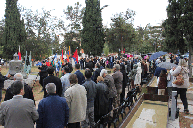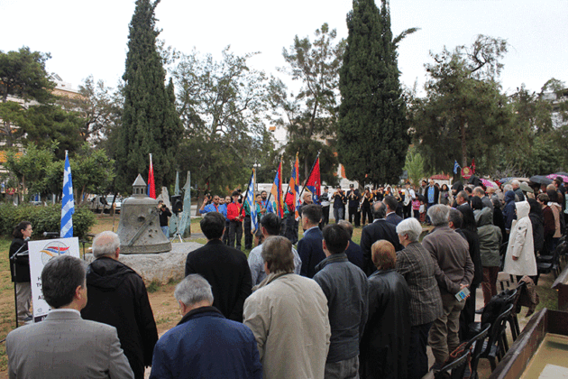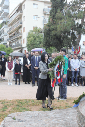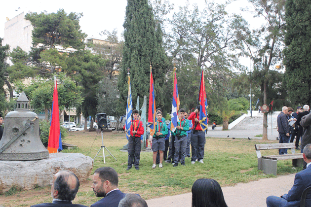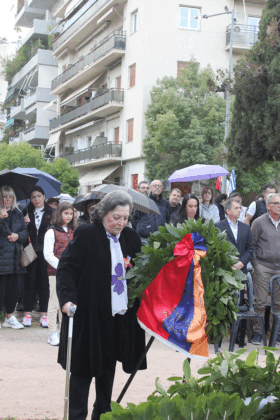 Հ.Մ.Ը.Մ.ի սկաուտներու պատուոյ ազդանշանին տակ, տեղի ունեցաւ դափնեպսակներու զետեղում։ Յաջորդաբար պսակներ խոնարհեցուցին Հ.Հ. հիւպատոս Լիանա Մարութեան, Ատիկէի փոխմարզպետ Խրիսթոս Թէոտորուփուլոս, կուսակցութիւններու ներկայացուցիչները, Նէա Զմիռնիի քաղաքապետ Եորղոս Քութելաքիս, համապոնտական միութեան ներկայացուցիչը եւ հայ գաղութին անունով ընկ. Մաննիկ Աշրեան։