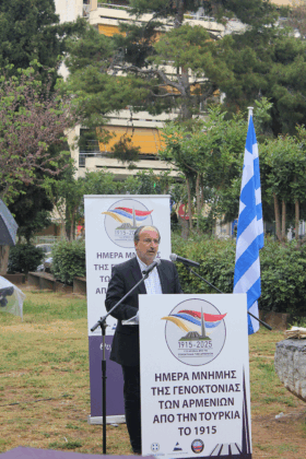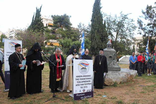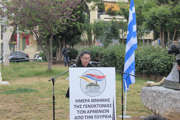 Ելոյթի բացումը կատարեց ընկ. Ալիս Ապրոյեան, որ նախապէս անդրադարձաւ Ատրպէյճանի կողմէ Արցախի բռնագրաւման եւ անոր բնիկ ժողովուրդի ամբողջական տեղահանման ու մշակութային ժառանգութեան ոչնչացման։ Նաեւ լայն անդրադարձ կատարեց Թուրքիոյ կողմէ 110 տարի անպատժելի մնացած ցեղասպանութեան իրողութեան մասին եւ շեշտեց հայ ժողովուրդի պայքարի աննկուն կամքը, հաստատելու պատմական ճշմարտութիւնը եւ հատուցում ստանալու։ Նաեւ խօսողը ընդգծեց յոյն ժողովուրդի զօրակցութիւնն ու Հայոց ցեղասպանութեան ճանաչումը Յունաստանի խորհրդարանին կողմէ։ Յաջորդաբար, խօսք առին կուսակցութիւններու ներկայացուցիչները, որոնք անվառան դատապարտեցին Հայոց ցեղասպանութեան ոճիրը, պահանջեցին ցեղասպանութեան ճանաչումը Թուրքիոյ կողմէ եւ դատապարտեցին թուրք-ատրպէյճանական յարձակողականութիւնը Արցախի վրայ։ Անդրադառնալով Արցախի հայաթափումին, շեշտեցին պետութիւններու եւ միջազգային ընկերութեան անտարբերութեան կեցուածքը հանդէպ հայ ժողովուրդի կրած ողբերգութեան։