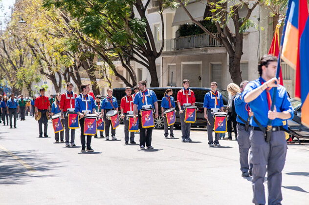 Սկաուտներու նուագախումբը եւս հնչեցուց կշռութաւոր եղանակներ, իսկ ետին՝ կը հետեւէին պաշտօնական հիւրերու խումբը եւ ժողովրդային բազմահարիւր համախմբումը։ Տիրական էր Հ.Յ.Դ. Երիտ. միութեան անդամներու մասնակցութիւնը, որոնք մեծադիր պաստառներով կը յայտնէին իրենց պահանջատիրական կամքը։ Ի տես պարզուած տպաւորիչ տեսարանին, անցորդներու եւ վարորդներու հիացումը յայտնուեցաւ ջերմ զգացումներով եւ հայասիրական կեցուածքով։