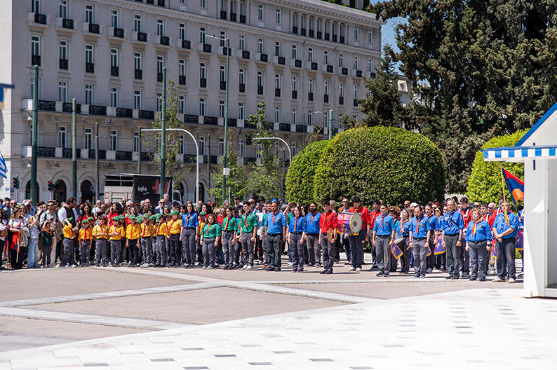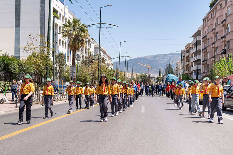 Օրուան հանդիսավարի ազդանշանին հետեւելով, պաշտօնական հիւրերը եւ ժողովուրդը քայլերթ կատարեցին դէպի Սինտաղմայի Անծանօթ Զինուորի յուշադամբանը։ Քայլարշաւի ամբողջ տեւողութեան, երաժշտութիւնը կը հնչէր Աթէնքի քաղաքապետական փողերախումբին կողմէ, որուն կը յաջորդէին Հ.Մ.Ը.Մ.-ի սկաուտներու երկար շարքերը, հպարտօրէն պարզած ըլլալով ազգային դրօշները։