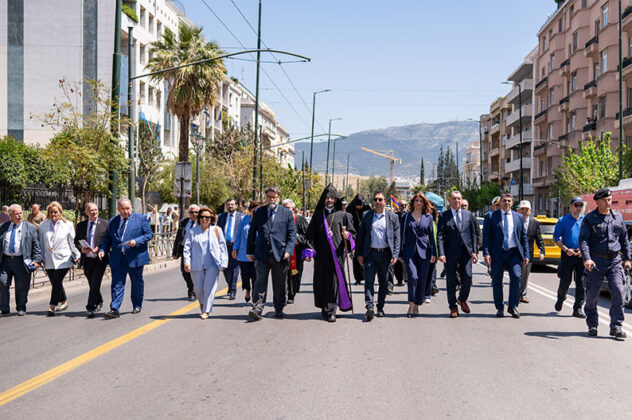 Որոշեալ ժամուն մուտք գործեց Յունաստանի արտաքին գործոց նախարար եւ հայ ժողովուրդի մեծ բարեկամ Նիքոս Տենտիաս, իր կողքին ունենալով Յունաստանի Զինեալ ուժերու պետ զօր. Տիմիթրիոս Խուփիսը, երկրի նաւային ուժի ընդհ. պետ զօր. Տիմիթրիոս Քաթարասը եւ քանի մը տասնեակ բարձրաստիճան սպաներ։ Յունաստանի խորհրդարանը կը ներկայացնէր երեսփոխան եւ հայ-յունական միջխորհրդարանական բարեկամութեան նախագահ Վասիլիս Իքոնոմու։ Նաեւ, խորհրդարանի կուսակցութիւնները կը ներկայացուէին ծանօթ երեսփոխաններու կողմէ, ինչպէս Փաւլոս Խրիսթիտիս, Քաթերինա Նոթոփուլու, Սթիլիանոս Ֆոթոփուլոս, Աթինա Լինու, Աթանասիոս Խալքիաս եւ ուրիշներ։
