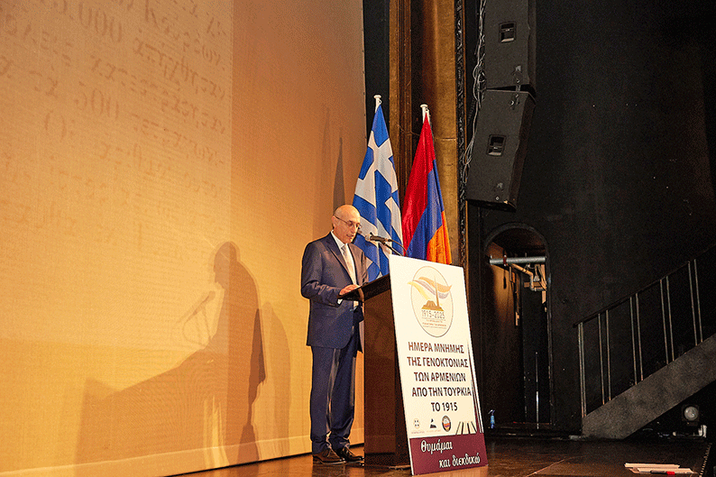 Բեմ հրաւիրուեցաւ Յունաստանի արտաքին գործոց փոխնախարար Եաննիս Լովերտոս, որ պաշտօնական խօսքէն անդին, յուզումով անդրադարձաւ իր հասակ նետած թաղամասին մէջ հայ գաղթական սերունդի զաւակներու հետ շփման մասին, յարգանքի իր խօսքը տալով Արեւելքի ցեղասպանուած ժողովուրդներու կրած չարչարանքներուն համար։ Մասնաւորելով իր ուղերձը Հայոց ցեղասպանութեան վրայ, նշեց անոր անպատժելի մնալու իրողութիւնը եւ մաղթեց, որ տարածաշրջանէն ներս հաստատուի խաղաղութիւն եւ համակեցութիւն։