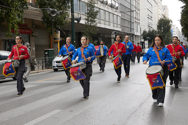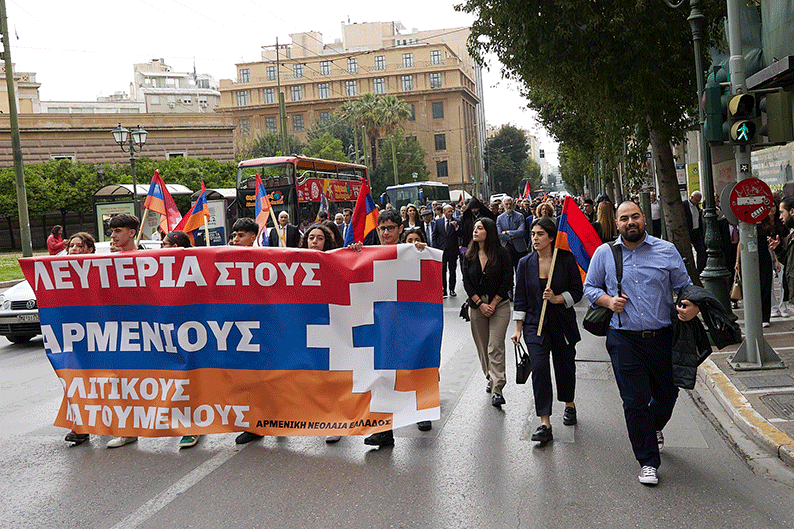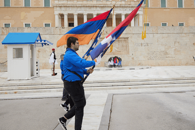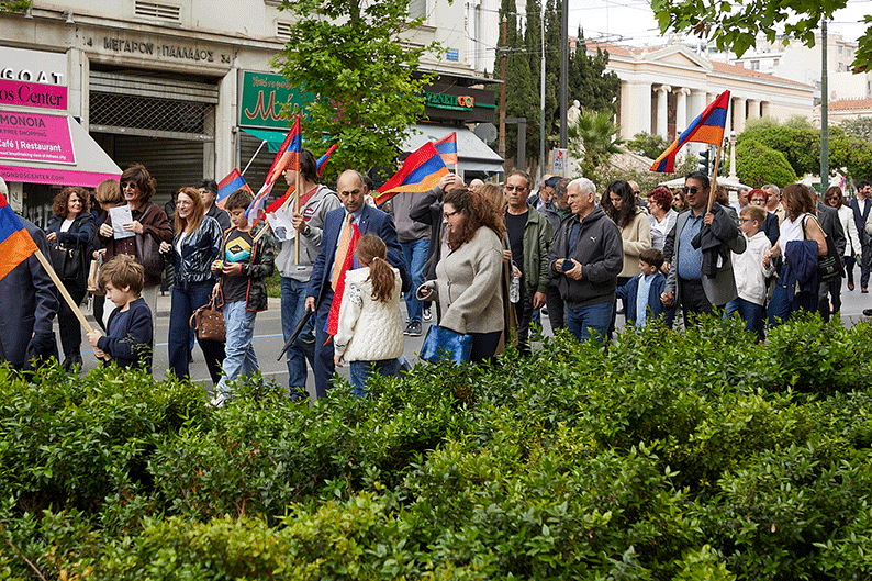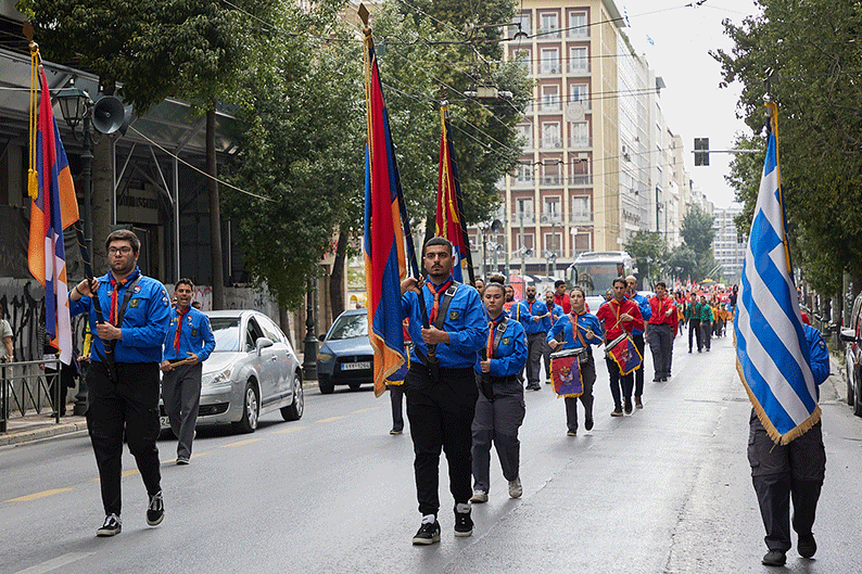Հանդիսավարի հրաւէրին հետեւելով, պաշտօնական հիւրերը եւ ժողովուրդը մաս կազմեցին ժողովրդային տպաւորիչ քայլերթին դէպի Անծանօթ Զինուորի յուշադամբանը։ Աթէնքի քաղաքապետական փողերախումբի հնչիւններուն կը հետեւէին Հ.Մ.Ը.Մ.-ի սկաուտական երկար շարքերը, առաջնորդութեամբ Յունաստանի, Հայաստանի, Արցախի եւ Հ.Մ.Ը.Մ.-ի դրօշներուն, իսկ մէջընդմէջ սկաուտական նուագախումբը եւս նուագեց քայլերթի եղանակներ։ Անոնց կը հետեւէր պաշտօնական հիւրերու եւ ժողովուրդի բազմամարդ թափորը, իսկ Հ.Յ.Դ. Երիտ. եւ Պատանեկան միութեան անդամները պարզած էին մեծադիր պաստառներ ու դրօշակներ։