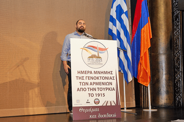 Կուռ եւ համարձակ ուղերձով հանդէս եկաւ Հ.Յ.Դ. Յունաստանի Երիտասարդական միութեան ներկայացուցիչ ընկ. Սերճիօ Մանկոյեան, որ դատապարտեց Թուրքիոյ կողմէ գործուած Հայոց ցեղասպանութիւնը եւ Արցախի հայաթափումը, ընդգծելով, որ հայ երիտասարդութեան պարտքը կը մնայ պայքարիլ անարդարութեան դէմ մինչեւ վերջնական հատուցում։