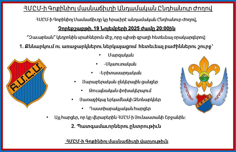 ԳԼԽԱՒՈՐ ԷՋ ԳԱՂՈՒԹԱՅԻՆ Յայտարարութիւններ Հ.Մ.Ը.Մ.ի Գոքիիոյ մասնաճիւղի անդամական Ընդհանուր ժողով ԳԱՂՈՒԹԱՅԻՆՅայտարարութիւններ Հ.Մ.Ը.Մ.ի Գոքիիոյ մասնաճիւղի անդամական Ընդհանուր ժողով 18 Նոյեմբեր 2025 5 0 ՅԱՐԱԿԻՑ ՅՕԴՈՒԱԾՆԵՐԱՒԵԼԻ ՇԱՏ ՀԵՂԻՆԱԿԻ Յայտարարութիւններ Պազար Գոքինիոյ մէջ Յայտարարութիւններ Համազգայինի Յունաստանի 27-րդ Ներկայացուցչական Ժողով Յայտարարութիւններ Անդամական ընդհանուր ժողով - Advertisement -Վերջին գրառումներ 200 երիտասարդներ եւ պատանիներ պանծացուցին հայկական ժողովրդային պարերը 14 Նոյեմբեր 2025 Առաջնորդ Սրբազան հօր այցելութիւնը Թեսաղոնիկէ եւ Սերրես Մասնակցութիւն յունաց ազգային տօնին 14 Նոյեմբեր 2025 Հայ Աւետարանական եկեղեցւոյ տարեկան պազարը 14 Նոյեմբեր 2025 Հայ աշակերտներու փայլուն յաջողութիւնը 14 Նոյեմբեր 2025 Հաղորդագրութիւն 7 Նոյեմբեր 2025